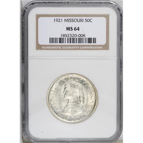 <B>1921 50C Missouri MS64 NGC.</B></I> Choice and highly lustrous with pale ice-blue and champagne patina on the reverse. Typically struck with the usual weakness on the portrait's cap and the frontiersman's back.<BR><BR><b>Shipping:</b> Coin/Currency (<a target="_blank" href="http://www.heritageauctions.com/common/shipping.php">view shipping information</a>)