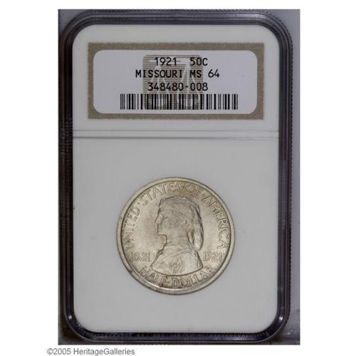 <B>1921<50C> Missouri MS64 NGC.</B></I> Lustrous surfaces are visited by a thin veneer of light champagne patination, and display a few minute grade-defining marks on the obverse. The design elements are well defined throughout.