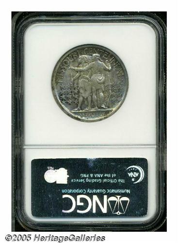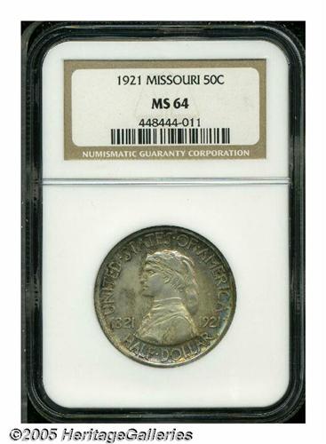 <B>1921<50C> Missouri MS64 NGC.</B></I> Watery steel-green, lilac, light-gray, and golden-tan colors adorn the well preserved surfaces of this crisply struck near-Gem. The luster is typically satiny, and there are only two to three small marks on either side of the coin.
