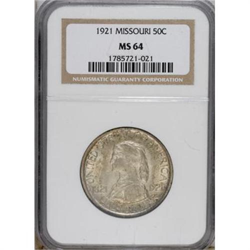 <B>1921 50C Missouri MS64 NGC.</B></I> Satiny luster and light, speckled bronze patina are present on both sides of this near-Gem, a lovely representative of this often-challenging early commemorative issue. Carefully preserved with minimal marks for the grade. <BR><BR><b>Shipping:</b> Coins & Currency (<a target="_blank" href="http://www.heritageauctions.com/common/shipping.php">view shipping information</a>)