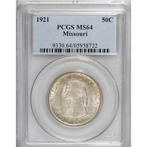 <B>1921 50C Missouri MS64 PCGS.</B></I> Light lime, gunmetal-gray, and pink-gold adorn this lustrous example. The reverse is well preserved, while the left obverse is moderately abraded. A desirable silver commemorative type.<BR><BR><b>Shipping:</b> Coins & Currency (<a target="_blank" href="http://www.heritageauctions.com/common/shipping.php">view shipping information</a>)
