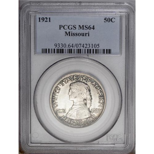 <B>1921 50C Missouri MS64 PCGS.</B></I> Occasional splashes of steel-gray toning interact adorn radiantly lustrous surfaces that are complemented by sharply struck devices. Minute marks on the obverse cheek and legs of the reverse figures just barely preclude the achievement of the next highest grade. A stunning, highly attractive commemorative.