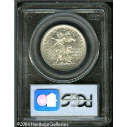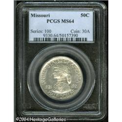 1921 50C Missouri MS64 PCGS. Silver-gray surfaces <B>1921 50C Missouri MS64 PCGS.</B></I> Silver-gray surfaces display nice luster and adequately struck motifs. Grade-limiting marks are seen on the obverse portrait, and on the back and left arm of the reverse frontiersman. <BR><BR><B>Important notice:</B> Heritage usually auctions material at the rate of 200-250 lots per hour. On some occasions eBay Live bid software or the Internet may not be able to keep up with the pace of the auction. We recommend placing a realistic absentee bid now as insurance to avoid disappointment. Occasionally the auctioneer may eliminate or reject an eBay Live bid, and the auctioneer may also reopen a lot after the close of the eBay live bidding (usually because we missed an audience bid), and may reject your bid even if it shows you as the winning bidder. By bidding via eBay Live, you agree that Heritage may award the lot to another bidder at its sole discretion under the circumstances described above or any other reasonable circumstances. Since eBay bids are not shown to us until we open the lot on the floor, we treat those bids just like floor bids. In most cases the floor responds before the eBay bid is presented to us, due to Internet lag time, so for consistency we have made it a policy that floor bids are always considered first over tie eBay live bids. Also please note that all Heritage lots purchased through eBay Live carry a 20% Buyer's Premium. Please make sure you read the Terms and Conditions before you bid. This lot is being auctioned in conjunction with a live floor auction by Heritage Galleries & Auctioneers. All final auction and invoice information will be supplied by Heritage Galleries & Auctioneers, and all other information should be considered preliminary. Lot:7910