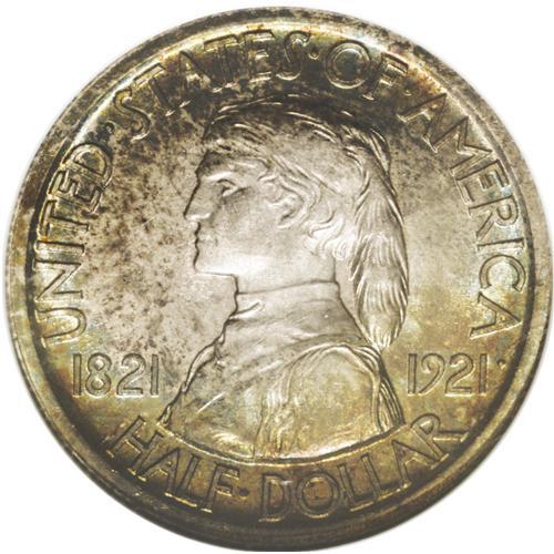 <B>1921<50C> Missouri MS65 NGC.</B></I> Sprays of apricot-red, lime-green, and blue-gray iridescence drift over exceptionally smooth surfaces. The shimmering, underlying satiny textured finish is unimpeded by the toning, and we have no complaints about the bold strike. Conditionally scarce. Census: 212 in 65, only 23 are finer (6/06).