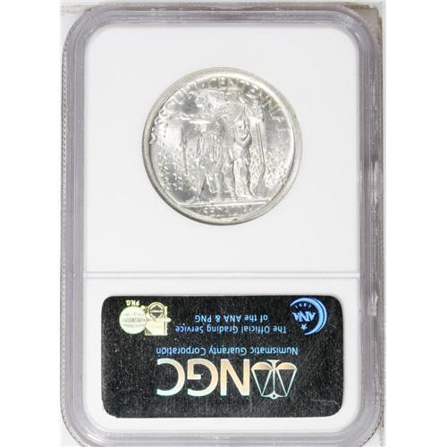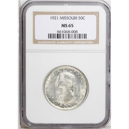 <B>1921<50C> Missouri MS65 NGC.</B></I> The Missouri half dollar is one of the key commemorative issues and it is extremely difficult to locate with any degree of positive eye appeal. This example has frosty and highly lustrous silver surfaces with a few tiny freckles of dark brown toning on each side. The fields on both sides are covered with swirling die polish.