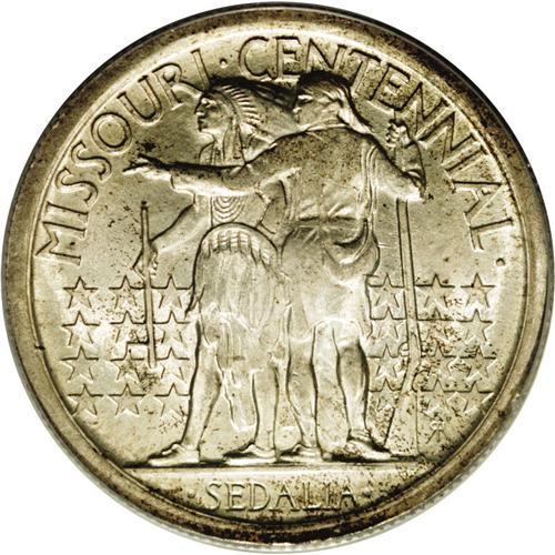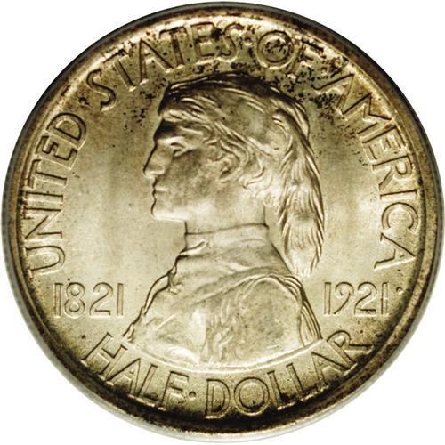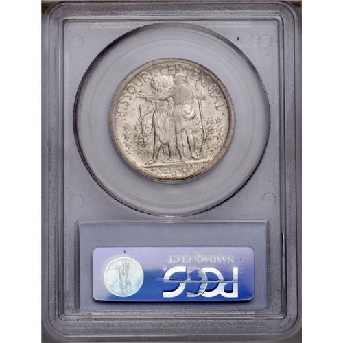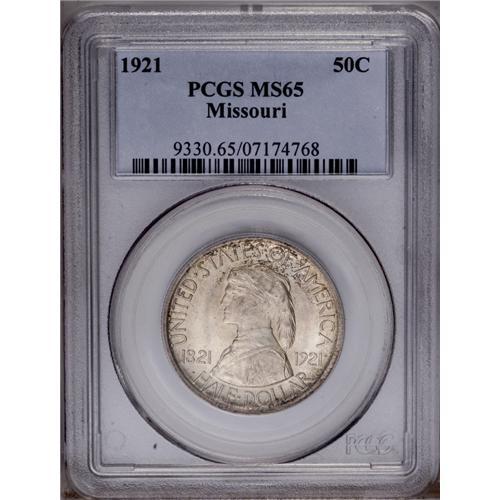 <B>1921<50C> Missouri MS65 PCGS.</B></I> A satiny Gem with dove-gray surfaces that are accented with scattered russet-brown toning spots on both sides. The strike is good, missing only the slightest detail on the highest points, and there are no mentionable abrasions. A conditionally scarce issue above MS64.