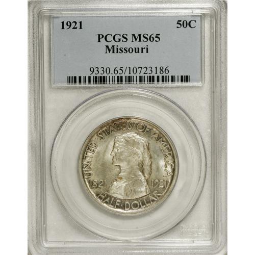 <B>1921 50C Missouri MS65 PCGS.</B></I> Chestnut-gold and sky-blue tones grace this satiny and suitably struck Missouri half. Nearly immaculate aside from minor contact on the cheek. A splendid example of this conditionally challenging and relatively early silver commemorative type.<BR><BR><b>Shipping:</b> Coins & Currency (<a target="_blank" href="http://www.heritageauctions.com/common/shipping.php">view shipping information</a>)