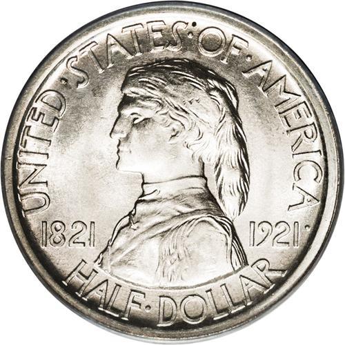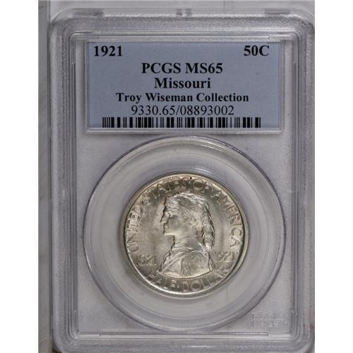 <B>1921<50C> Missouri MS65 PCGS.</B></I> An essentially brilliant silver-white example, save for a glint of reverse gold. A couple of reeding marks on the frontiersman's cap preclude a higher grade, but the eye appeal is substantial. PCGS has graded 27 specimens finer (8/06).<BR><I>From The Troy Wiseman Collection.</B></I>