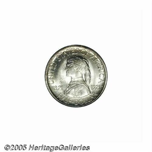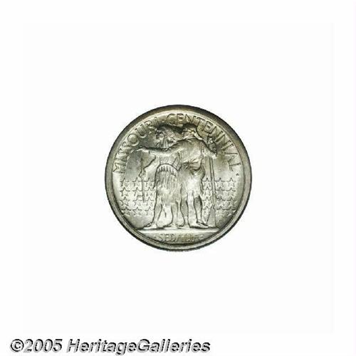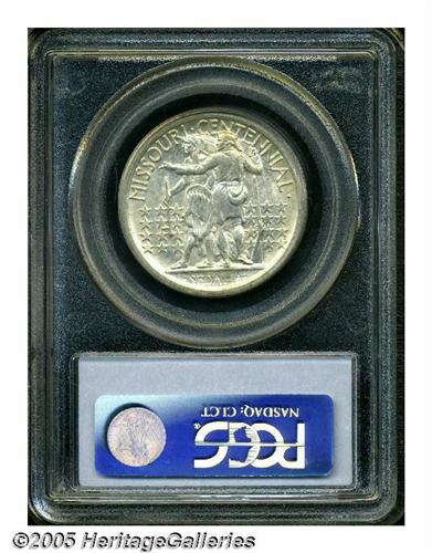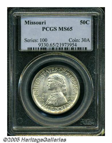 <B>1921<50C> Missouri MS65 PCGS.</B></I> This always-popular Commemorative was struck in 1921, before the widespread striking of commemorative halves in the 1930s for any (or no) reason. The Missouri half was struck to actually commemorate something: the centennial of the admission of Missouri to the Union as the 24th state. This is a lovely and attractive coin that has soft, frosted mint luster, and there is just a touch of light gray toning on each side. The design elements are well executed throughout. PCGS has graded 27 pieces finer (6/05).
