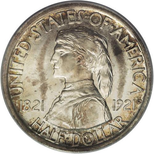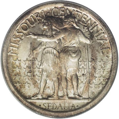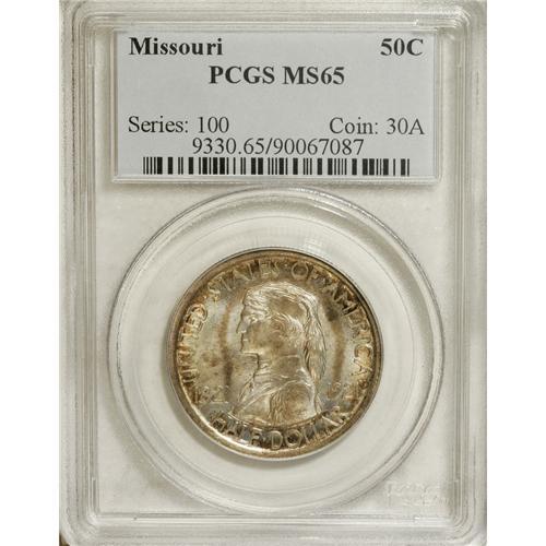 <B>1921 50C Missouri MS65 PCGS.</B></I> While the traditional mintage figures for the 2x4 and "plain" varieties of the Missouri commemorative half list a net production of 15,428 pieces for the latter and only 5,000 examples for the former, most numismatic scholarship indicates that unimpaired examples appear on the market with roughly equal frequency. Soft, pleasing luster appears beneath warm russet and silver-blue patina on this attractive "plain" Missouri half. On the obverse, a band of reddish-bronze patina that surrounds the portrait creates a subtle nimbus effect.<BR><I>From The Cary & Cheryl Porter Collection.</B></I><BR><BR><b>Shipping:</b> Coins & Currency (<a target="_blank" href="http://www.heritageauctions.com/common/shipping.php">view shipping information</a>)