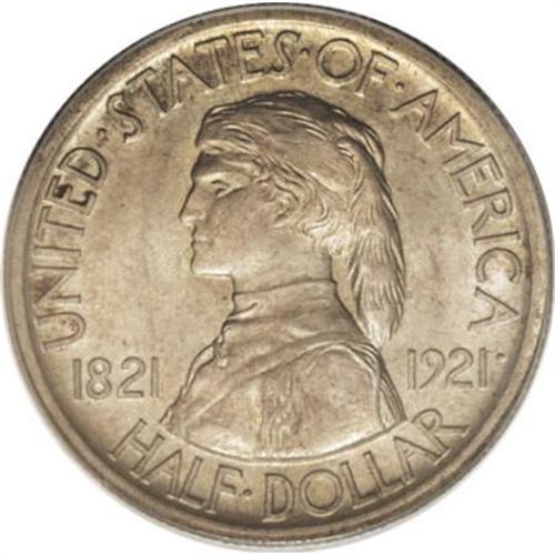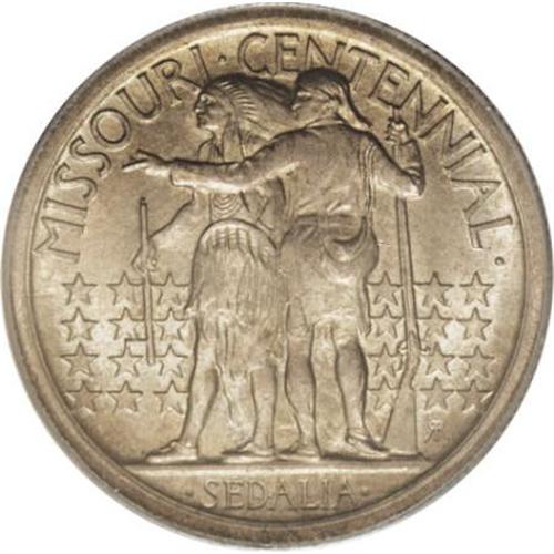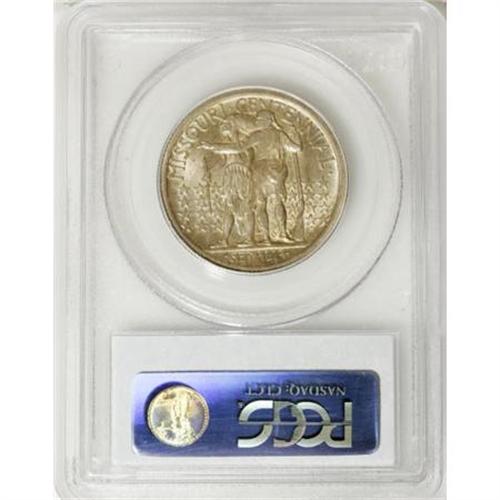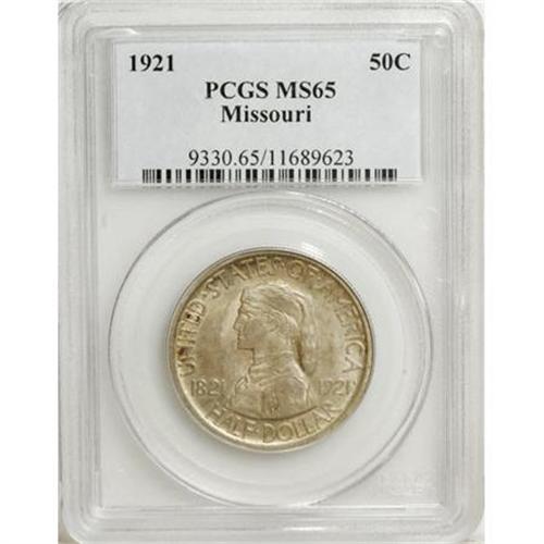 <B>1921 50C Missouri MS65 PCGS.</B></I> A uniform coating of olive-gray patina fails to diminish the frostiness of this well preserved Missouri half dollar. The strike is typically lacking on the highpoints of the major devices and a vertical mark is noticed on the frontiersman's cheek. Much above-average quality for this popular early commemorative.<BR><BR><b>Shipping:</b> Coins & Currency (<a target="_blank" href="http://www.heritageauctions.com/common/shipping.php">view shipping information</a>\)