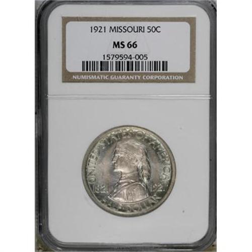 <B>1921 50C Missouri MS66 NGC.</B></I> This Premium Gem Missouri Plain half dollar ranks nearly at the top of the numismatic world, with only two finer pieces certified. It is sharply defined with details about as sharp as the original dies. This piece has lustrous silver surfaces with faint blue, sea-green, and pale lilac toning on each side. Census: 26 in 66, 2 finer (1/08).<BR><BR><b>Shipping:</b> Coins & Currency (<a target="_blank" href="http://www.heritageauctions.com/common/shipping.php">view shipping information</a>)