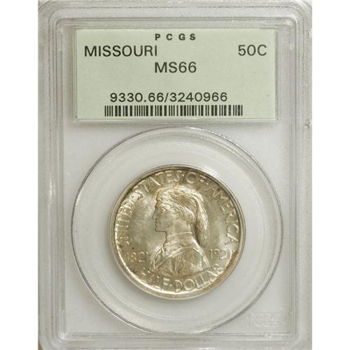 <B>1921 50C Missouri MS66 PCGS.</B></I> The Missouri is among the scarcest commemorative silver types, particularly in better Mint State grades. This crisply struck and lustrous Premium Gem has light golden-brown toning. A few unimportant faint grazes are noted on the highpoints. Housed in a green label holder. Population: 28 in 66, 0 finer (3/07).<BR><BR><b>Shipping:</b> Coins & Currency (<a target="_blank" href="http://www.heritageauctions.com/common/shipping.php">view shipping information</a>)