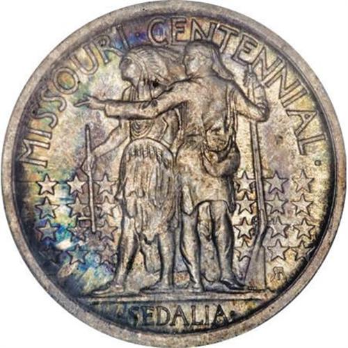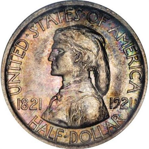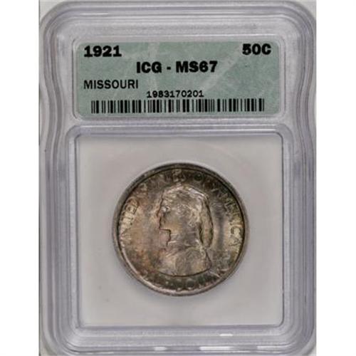 <B>1921 50C Missouri MS67 ICG.</B></I> A kaleidoscope of colors can be seen on both sides of this Superb Gem. Variants of lime-green, magenta, sapphire, citrine and pearl adorn extremely clean and well-struck surfaces. The luster is scintillating and the overall appeal is every bit Superb. While examining a coin under magnification can sometimes make it appear less desirable by highlighting its flaws, inspection under a loupe makes one more appreciative of the quality and coloration of this impeccable example that separates it from its peers.<BR><BR><b>Shipping:</b> Coins & Currency (<a target="_blank" href="http://www.heritageauctions.com/common/shipping.php">view shipping information</a>)