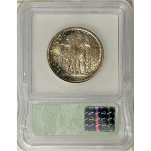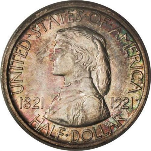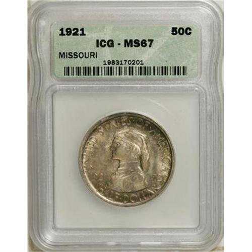 <B>1921 50C Missouri MS67 ICG.</B></I> A kaleidoscope of colors graces this Superb Gem. Lime-green, magenta, sapphire, citrine and pearl adorn extremely clean and well-struck surfaces. The luster is scintillating and the eye appeal is magnificent. A marvelous example that shows only a handful of minuscule flaws, even under magnification.<BR><BR><b>Shipping:</b> Coins & Currency (<a target="_blank" href="http://www.heritageauctions.com/common/shipping.php">view shipping information</a>)