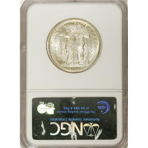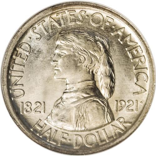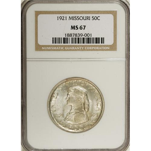 <B>1921 50C Missouri MS67 NGC.</B></I> While no name is ascribed to the frontiersman who appears on the Missouri statehood centennial halves, authoritative references such as Breen-Swiatek and Bowers consider him to be Daniel Boone, who died in 1820. The reverse also features Boone as part of the genre scene, one of the few cases in American numismatics where the same person appears on both sides of a coin. Oddly enough, this would happen to Boone again, as the 1934-1938 issues commemorating the bicentennial of his birth depict him on both sides, in portrait form on the obverse and with an Indian on the reverse.<BR> This attractive "plain" Missouri half, a coin worthy of the finest collection, has frosty luster that is particularly noticeable on the devices. A hint of blue-gray patina is noted in the fields and two thin, dark diagonal lines appear near the frontiersman's feet, but the surfaces are silver-gray otherwise. Many Missouri "plain" halves were sold to non-collectors at the 1921 Missouri State Fair in Sedalia, and a survey of certified populations reveals just how few examples survive in this condition: NGC has certified just two Superb Gems, and PCGS has graded none (3/07).<BR><I>From The Cary & Cheryl Porter Collection.</B></I><BR><BR><b>Shipping:</b> Coins & Currency (<a target="_blank" href="http://www.heritageauctions.com/common/shipping.php">view shipping information</a>)