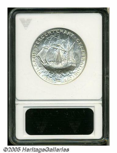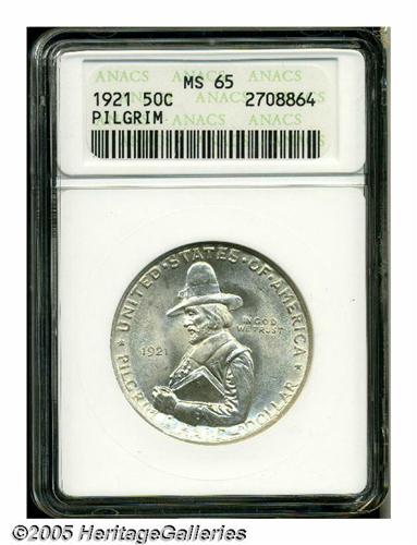 <B>1921<50C> Pilgrim MS65 ANACS.</B></I> Faintly toned with gold color, this lustrous and splendidly struck Gem has a pristine reverse and only a couple of concealed marks on the obverse. Less available that the introductory 1920 Pilgrim.