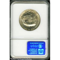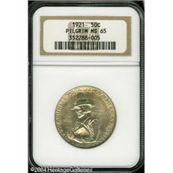 1921 50C Pilgrim MS65 NGC. Fully lustrous surfaces <B>1921 50C Pilgrim MS65 NGC.</B></I> Fully lustrous surfaces reveal touches of olive color and sharply struck design elements. A few minute contact marks are noted on the Pilgrim's hat and collar, and on the ship's main sail. <BR><BR><B>Important notice:</B> Heritage usually auctions material at the rate of 200-250 lots per hour. On some occasions eBay Live bid software or the Internet may not be able to keep up with the pace of the auction. We recommend placing a realistic absentee bid now as insurance to avoid disappointment. Occasionally the auctioneer may eliminate or reject an eBay Live bid, and the auctioneer may also reopen a lot after the close of the eBay live bidding (usually because we missed an audience bid), and may reject your bid even if it shows you as the winning bidder. By bidding via eBay Live, you agree that Heritage may award the lot to another bidder at its sole discretion under the circumstances described above or any other reasonable circumstances. Since eBay bids are not shown to us until we open the lot on the floor, we treat those bids just like floor bids. In most cases the floor responds before the eBay bid is presented to us, due to Internet lag time, so for consistency we have made it a policy that floor bids are always considered first over tie eBay live bids. Also please note that all Heritage lots purchased through eBay Live carry a 20% Buyer's Premium. Please make sure you read the Terms and Conditions before you bid. This lot is being auctioned in conjunction with a live floor auction by Heritage Galleries & Auctioneers. All final auction and invoice information will be supplied by Heritage Galleries & Auctioneers, and all other information should be considered preliminary. Lot:7936