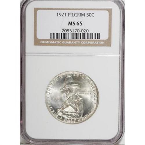 <B>1921 50C Pilgrim MS65 NGC.</B></I> NGC Census: (647/158). PCGS Population (612/263). Mintage: 20,053. Numismedia Wsl. Price for NGC/PCGS coin in MS65: $520. (#9360)<BR><BR><b>Shipping:</b> Coins & Currency (<a target="_blank" href="http://www.heritageauctions.com/common/shipping.php">view shipping information</a>)