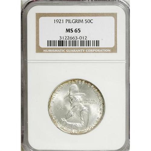 <B>1921 50C Pilgrim MS65 NGC.</B></I> . NGC Census: (650/159). PCGS Population (632/262). Mintage: 20,053. Numismedia Wsl. Price for NGC/PCGS coin in MS65: $480. (#9360)<BR><BR><b>Shipping:</b> Coins & Currency (<a target="_blank" href="http://www.heritageauctions.com/common/shipping.php">view shipping information</a>)