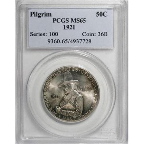 <B>1921 50C Pilgrim MS65 PCGS.</B></I> PCGS Population (640/263). NGC Census: (646/159). Mintage: 20,053. Numismedia Wsl. Price for NGC/PCGS coin in MS65: $480. (#9360)<BR><BR><b>Shipping:</b> Coins & Currency (<a target="_blank" href="http://www.heritageauctions.com/common/shipping.php">view shipping information</a>)