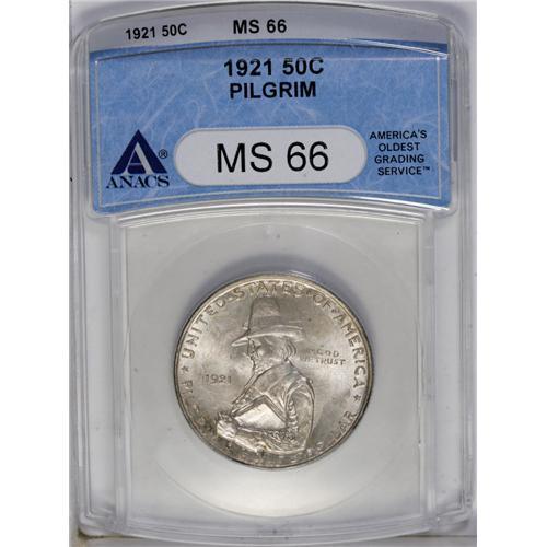 <B>1921<50C> Pilgrim MS66 ANACS.</B></I> Hints of khaki on the Pilgrim contrast with the slight milky patina of the fields. The sharply struck devices are virtually mark-free.<BR><I>Ex: Stack's, 4/50, lot 2.</B></I><BR><I>From The Redfjord Collection.</B></I>