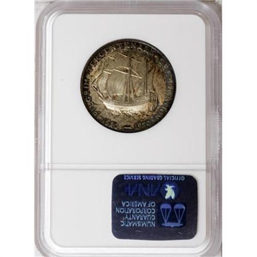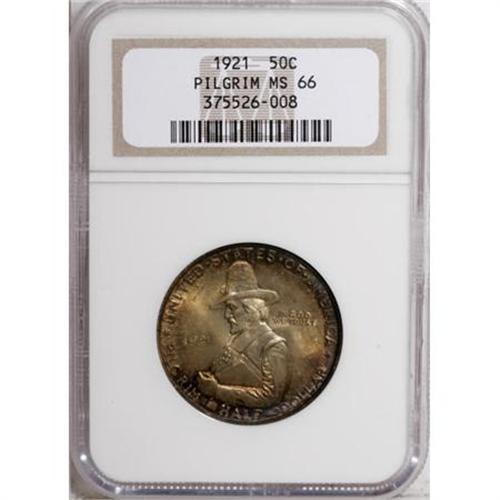 <B>1921 50C Pilgrim MS66 NGC.</B></I> Sea-green, gold, and rose-red endow this shimmering, precisely struck, and carefully preserved Pilgrim half. An aesthetic treasure from the second, low mintage year of the type.<BR><I>From The Cary & Cheryl Porter Collection, Part Three.</B></I><BR><BR><b>Shipping:</b> Coins & Currency (<a target="_blank" href="http://www.heritageauctions.com/common/shipping.php">view shipping information</a>\)