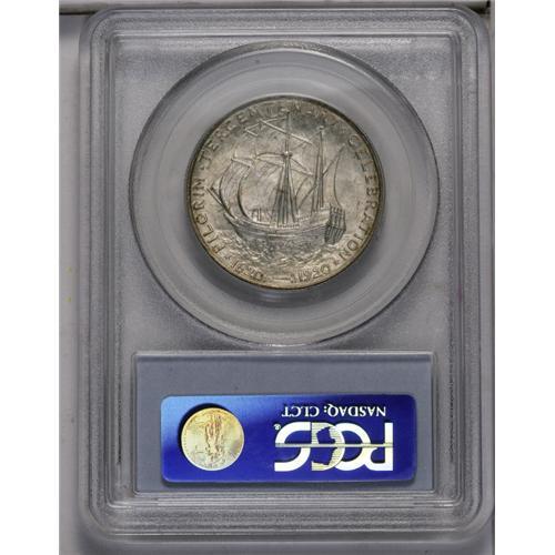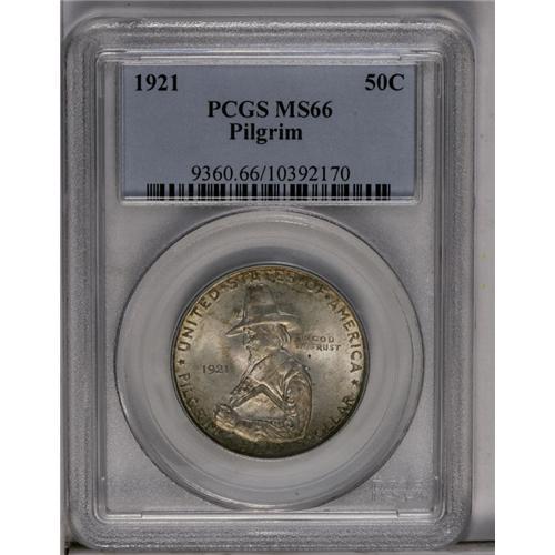 <B>1921<50C> Pilgrim MS66 PCGS.</B></I> Both sides of this Premium Gem have frosty silver luster with splashes of gold and iridescent toning along the borders. The Pilgrim Tercentenary half dollar was struck in two years, 1920 and 1921, with the latter from a much lower mintage of just 20,053 coins.
