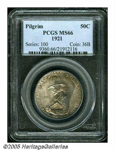 <B>1921<50C> Pilgrim MS66 PCGS.</B></I> Fully lustrous surfaces reveal moderate amounts of purple and blue color and sharply struck design elements. A few minute contact marks are noted in the obverse field, and on the ship's main sail.