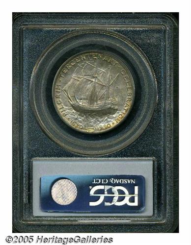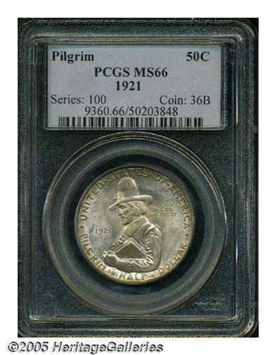 <B>1921<50C> Pilgrim MS66 PCGS.</B></I> Highly lustrous surfaces display pastel shades of rose-tan and ice-blue patination, and the design features are well impressed. A couple of minor marks in the Pilgrim's hair, and on the ship's mainmast and attendant rigging, are mentioned for accuracy. Just 29 pieces have been graded finer by PCGS and NGC combined (4/05).
