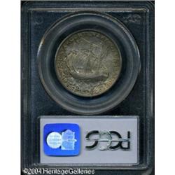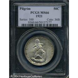 1921 50C Pilgrim MS66 PCGS. Lustrous obverse surfa <B>1921 50C Pilgrim MS66 PCGS.</B></I> Lustrous obverse surfaces are visited by a thin layer of golden-tan color accented by dappled russet at the edges, while the reverse features mottled russet, olive, and golden-brown toning throughout. The design elements are sharply impressed, and the surfaces are free of significant impairments. A miniscule mark in the lower left obverse field above the G of PILGRIM is mentioned for accuracy. <BR><BR><B>Important notice:</B> Heritage usually auctions material at the rate of 200-250 lots per hour. On some occasions eBay Live bid software or the Internet may not be able to keep up with the pace of the auction. We recommend placing a realistic absentee bid now as insurance to avoid disappointment. Occasionally the auctioneer may eliminate or reject an eBay Live bid, and the auctioneer may also reopen a lot after the close of the eBay live bidding (usually because we missed an audience bid), and may reject your bid even if it shows you as the winning bidder. By bidding via eBay Live, you agree that Heritage may award the lot to another bidder at its sole discretion under the circumstances described above or any other reasonable circumstances. Since eBay bids are not shown to us until we open the lot on the floor, we treat those bids just like floor bids. In most cases the floor responds before the eBay bid is presented to us, due to Internet lag time, so for consistency we have made it a policy that floor bids are always considered first over tie eBay live bids. Also please note that all Heritage lots purchased through eBay Live carry a 20% Buyer's Premium. Please make sure you read the Terms and Conditions before you bid. This lot is being auctioned in conjunction with a live floor auction by Heritage Galleries & Auctioneers. All final auction and invoice information will be supplied by Heritage Galleries & Auctioneers, and all other information should be considered preliminary. Lot:7937