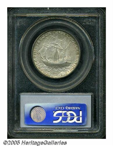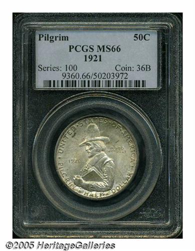<B>1921<50C> Pilgrim MS66 PCGS.</B></I> Lustrous surfaces display golden-gray patina, with faint hints of magenta and ice-blue, and are virtually devoid of mentionable contact marks. A small toning streak is noted in the upper right (facing) obverse field. The design elements are well impressed. As of April 2005, PCGS has certified 16 examples in higher grades.