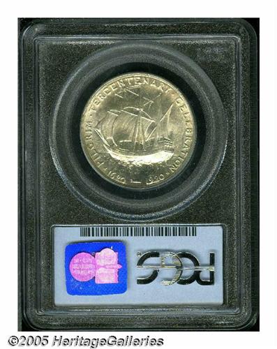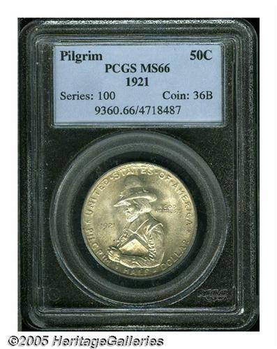 <B>1921<50C> Pilgrim MS66 PCGS.</B></I> The devices are well struck, while the legends near the border have minor softness of strike as they approach the rim. The flashy luster and well preserved fields add to the appeal of this lightly toned Gem. A couple of minute marks on the main mast of the reverse ship are mentioned for accuracy. As of May 2005, only 30 specimens have been graded higher by PCGS and NGC combined.