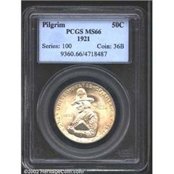1921 50C Pilgrim MS66 PCGS. The light olive-gold patina is attractive, and luster blazes across the unblemished surfaces. The strike is very sharp. A pleasing Gem.From the Tom Valos Collection. Important notice: We expect to be auctioning lots at the rate of 200-250 per hour. Sometimes eBay Premier live bid software cannot keep up with that pace, so we strongly recommend that you place a realistic proxy bid now as insurance to avoid disappointment. Also please note that all Heritage/CAA lots purchased through eBay Premier carry a 20% Buyer's Premium.