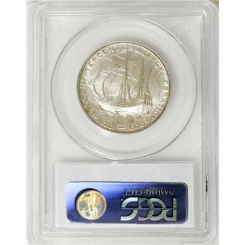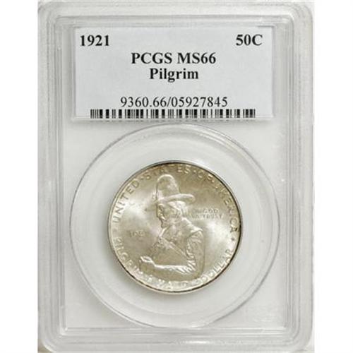 <B>1921 50C Pilgrim MS66 PCGS.</B></I> In addition to an especially bold strike, the silvery surfaces display uncommon frostiness for the issue and an occasional dash of reddish-brown toning at the borders.<BR><BR><b>Shipping:</b> Coins & Currency (<a target="_blank" href="http://www.heritageauctions.com/common/shipping.php">view shipping information</a>\)