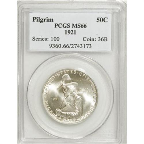 <B>1921 50C Pilgrim MS66 PCGS.</B></I> Intense luster and minimal patina are the most immediately visible aspects of this delightful 1921 Pilgrim piece, though closer inspection reveals just how well-preserved the coin is. The 1921 has a much lower mintage than its 1920 counterpart and is more elusive across most grades.<BR><I>From The Sterling Collection.</B></I><BR><BR><b>Shipping:</b> Coins & Currency (<a target="_blank" href="http://www.heritageauctions.com/common/shipping.php">view shipping information</a>)