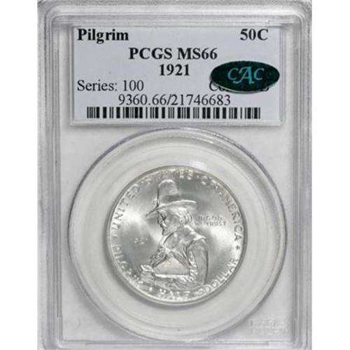 <B>1921 50C Pilgrim MS66 PCGS. CAC.</B></I> The 1921 Pilgrim half dollar is considerable than its 1920-dated brother. This frosty Premium Gem is an exceptional example with full mint brilliance. PCGS has only graded 17 finer pieces (1/08).<BR><I>From The Southwest Collection.</B></I><BR><BR><b>Shipping:</b> Coins & Currency (<a target="_blank" href="http://www.heritageauctions.com/common/shipping.php">view shipping information</a>)