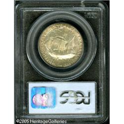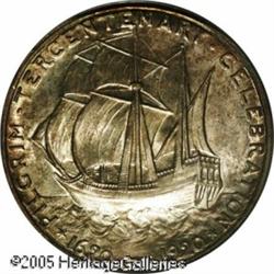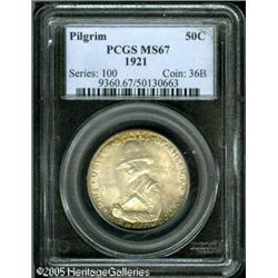 <B>1921 50C Pilgrim MS67 PCGS.</B></I> Lovingly preserved beneath milky silver-gray and speckled lilac patina, with a few flashes of deeper russet at the borders. As general rule, the earlier (pre 1930) commemorative issues are quite difficult in Superb condition and the 1921 Pilgrim is no exception. Population: 16 in 67, 0 finer (1/05). Lot:8565
