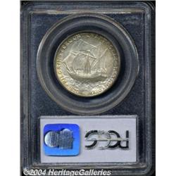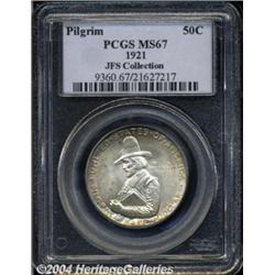 <B>1921<50C> Pilgrim MS67 PCGS.</B></I> Lovely powder-blue, golden-brown, and lilac colors invigorate the peripheries and frame the stone-gray centers. The major devices are exquisitely struck, although the high relief peripheral legends are not completely brought up, as is characteristic of this early Commemorative type. Virtually devoid of contact, and worthy of the finest advanced collection. A pair of thin but lengthy die cracks (as made) journey across the upper reverse field. The incused D initial below the elbow of Governor Bradford is sometimes confused with a Denver mintmark, however, it instead represents the engraver, Cyrus E. Dallin. No Commems were produced in Denver prior to the 1933-D Oregon Trail. Population: 13 in 67, none finer (6/04).<BR><I>From the JFS Collection, the #1 All-Time PCGS Registry Set.</B></I> <BR><BR><B>Important notice:</B> Heritage usually auctions material at the rate of 200-250 lots per hour. On some occasions eBay Live bid software or the Internet may not be able to keep up with the pace of the auction. We recommend placing a realistic absentee bid now as insurance to avoid disappointment. Occasionally the auctioneer may eliminate or reject an eBay Live bid, and the auctioneer may also reopen a lot after the close of the eBay live bidding (usually because we missed an audience bid), and may reject your bid even if it shows you as the winning bidder. By bidding via eBay Live, you agree that Heritage may award the lot to another bidder at its sole discretion under the circumstances described above or any other reasonable circumstances. Since eBay bids are not shown to us until we open the lot on the floor, we treat those bids just like floor bids. In most cases the floor responds before the eBay bid is presented to us, due to Internet lag time, so for consistency we have made it a policy that floor bids are always considered first over tie eBay live bids. Also please note that all Heritage lots purchased through eBay Live carry a 20% Buyer's Premium. Please make sure you read the Terms and Conditions before you bid. </span></font></tr></table></td></tr></table>