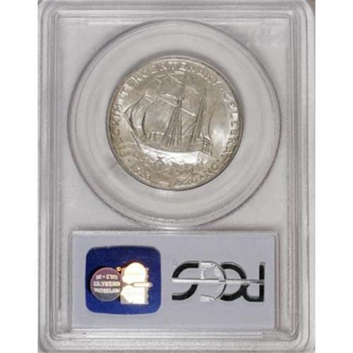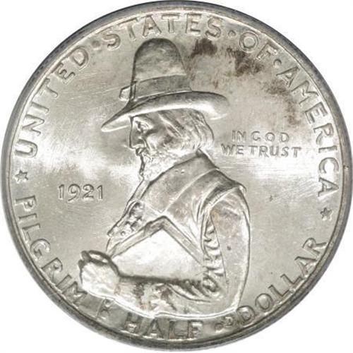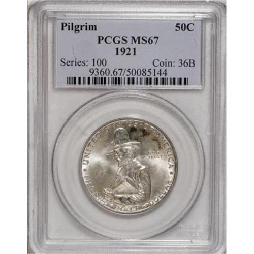 <B>1921 50C Pilgrim MS67 PCGS.</B></I> Radiant, mark-free surfaces show a few areas of splotchy russet color, and exhibit sharply impressed design features. Both sides are wonderfully preserved. Only rarely is this second year Pilgrim issue seen in such extraordinary condition. Population: 17 in 67, 0 finer (12/07).<BR><BR><b>Shipping:</b> Coins & Currency (<a target="_blank" href="http://www.heritageauctions.com/common/shipping.php">view shipping information</a>)