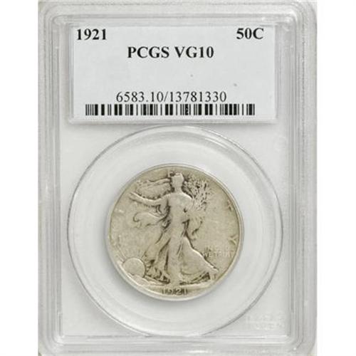 <B>1921 50C VG10 PCGS.</B></I> PCGS Population (48/455). NGC Census: (26/302). Mintage: 246,000. Numismedia Wsl. Price for NGC/PCGS coin in VG10: $201. (#6583)<BR><BR><B>Coin Engraver:</B> Adolph A. Weinman<BR><BR><b>Shipping:</b> Coins & Currency (<a target="_blank" href="http://www.heritageauctions.com/common/shipping.php">view shipping information</a>)