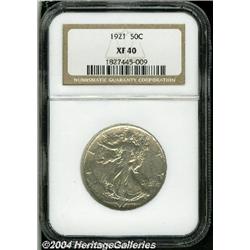 <B>1921<50C> XF40 NGC.</B></I> Bright silver-gray surfaces are remarkably clean. The '21-P has a remarkably low mintage of just 246,000 pieces. <BR><BR><B>Important notice:</B> Heritage usually auctions material at the rate of 200-250 lots per hour. On some occasions eBay Live bid software or the Internet may not be able to keep up with the pace of the auction. We recommend placing a realistic absentee bid now as insurance to avoid disappointment. Occasionally the auctioneer may eliminate or reject an eBay Live bid, and the auctioneer may also reopen a lot after the close of the eBay live bidding (usually because we missed an audience bid), and may reject your bid even if it shows you as the winning bidder. By bidding via eBay Live, you agree that Heritage may award the lot to another bidder at its sole discretion under the circumstances described above or any other reasonable circumstances. Since eBay bids are not shown to us until we open the lot on the floor, we treat those bids just like floor bids. In most cases the floor responds before the eBay bid is presented to us, due to Internet lag time, so for consistency we have made it a policy that floor bids are always considered first over tie eBay live bids. Also please note that all Heritage lots purchased through eBay Live carry a 20% Buyer's Premium. Please make sure you read the Terms and Conditions before you bid.
