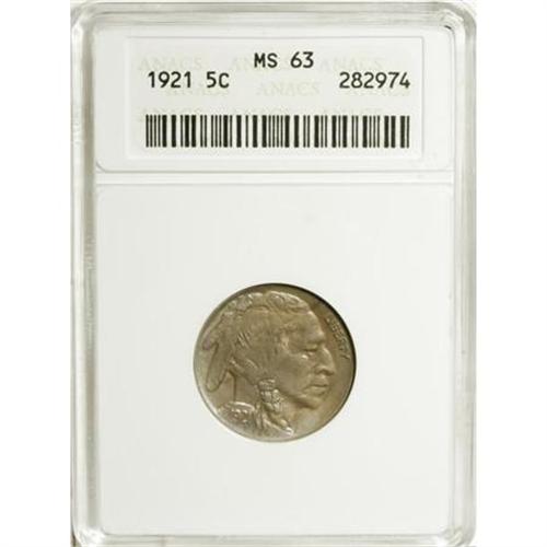 <B>1921 5C MS63 ANACS.</B></I> NGC Census: (81/367). PCGS Population (121/668). Mintage: 10,663,000. Numismedia Wsl. Price for NGC/PCGS coin in MS63: $232. (#3947)<BR><BR><B>Coin Engraver:</B> James E. Fraser<BR><BR><b>Shipping:</b> Coins & Currency (<a target="_blank" href="http://www.heritageauctions.com/common/shipping.php">view shipping information</a>)