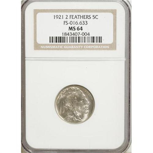 <B>1921 5C MS64 NGC.</B></I> FS-401, formerly FS-016.633. 2 Feathers. In recent years quite a number of these so-called "2 Feathers" varieties have been identified by numismatists, from more than ten different dates in the Buffalo nickel series. This near-Gem example is highly lustrous and well struck, with pleasing champagne-gray toning across both sides. Die polish reduces the detail of the Indian's eye, but post-striking marks are not immediately evident on either side. <BR><BR><B>Coin Engraver:</B> James E. Fraser<BR><BR><b>Shipping:</b> Coins & Currency (<a target="_blank" href="http://www.heritageauctions.com/common/shipping.php">view shipping information</a>)