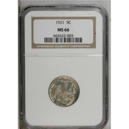 <B>1921 5C MS66 NGC.</B></I> Frosty surfaces are imbued with whispers of light gold, and are well preserved throughout. A sharp strike is apparent on the design features. Census: 50 in 66, 8 finer (10/06).<BR><BR><b>Shipping:</b> Coin/Currency (<a target="_blank" href="http://www.heritageauctions.com/common/shipping.php">view shipping information</a>)