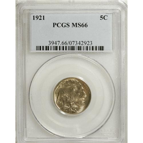 <B>1921 5C MS66 PCGS.</B></I> This Premium Gem has frosty gray surfaces with a thin veil of gold toning on both sides. It is remarkably well struck with nearly full design details. Just 18 finer pieces have been seen by PCGS (4/07).<BR><BR><b>Shipping:</b> Coins & Currency (<a target="_blank" href="http://www.heritageauctions.com/common/shipping.php">view shipping information</a>)
