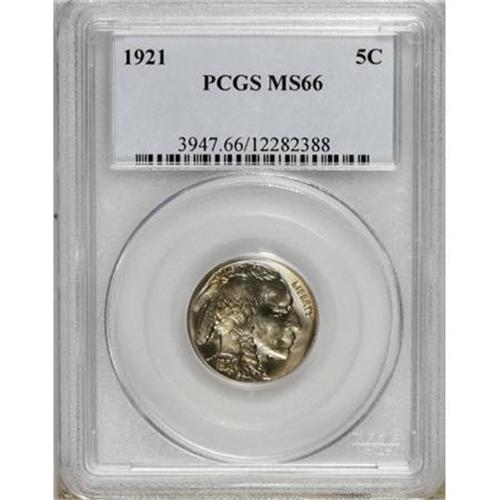 <B>1921 5C MS66 PCGS.</B></I> Beautiful ice-blue, gold, and cherry-red illuminate this shimmering and attractively preserved Premium Gem. The centers are exceptionally bold, and only the curve of the tail lacks intricate detail.<BR><BR><B>Coin Engraver:</B> James E. Fraser<BR><BR><b>Shipping:</b> Coins & Currency (<a target="_blank" href="http://www.heritageauctions.com/common/shipping.php">view shipping information</a>)
