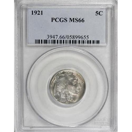 <B>1921 5C MS66 PCGS.</B></I> Lovely quicksilver luster and solid definition are the prime attributes of this predominantly nickel-gray example. Excellent preservation makes this a coin that should appeal to the date collector.<BR><BR><B>Coin Engraver:</B> James E. Fraser<BR><BR><b>Shipping:</b> Coins & Currency (<a target="_blank" href="http://www.heritageauctions.com/common/shipping.php">view shipping information</a>)