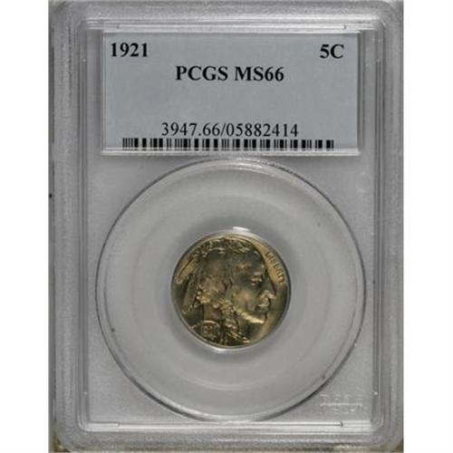 <B>1921 5C MS66 PCGS.</B></I> Rich olive and gold toning highlight the frosty surfaces of this lustrous Premium Gem. It is fully struck with extraordinary eye appeal. PCGS has only certified 18 finer examples (1/08).<BR><BR><B>Coin Engraver:</B> James E. Fraser<BR><BR><b>Shipping:</b> Coins & Currency (<a target="_blank" href="http://www.heritageauctions.com/common/shipping.php">view shipping information</a>)