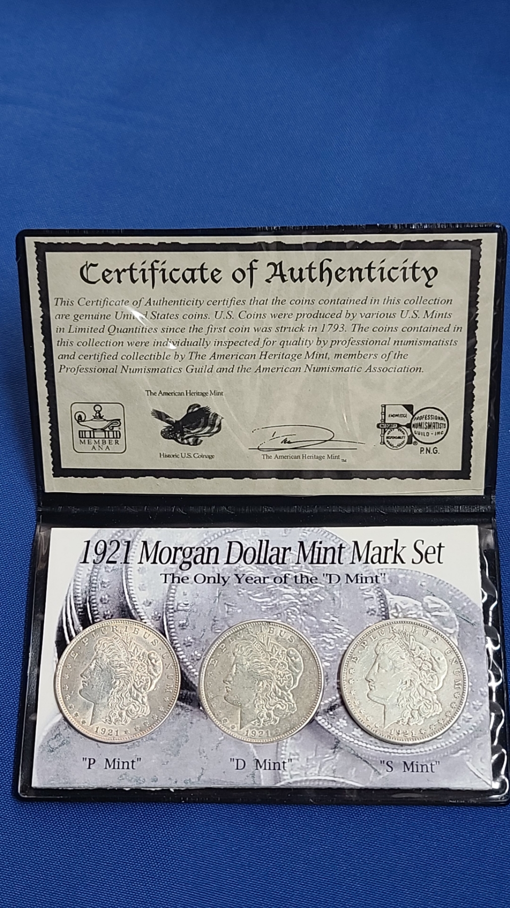 1921 90% Silver Morgan Dollar (3) Mint Mark Set With COA In The American Heritage Mint Display